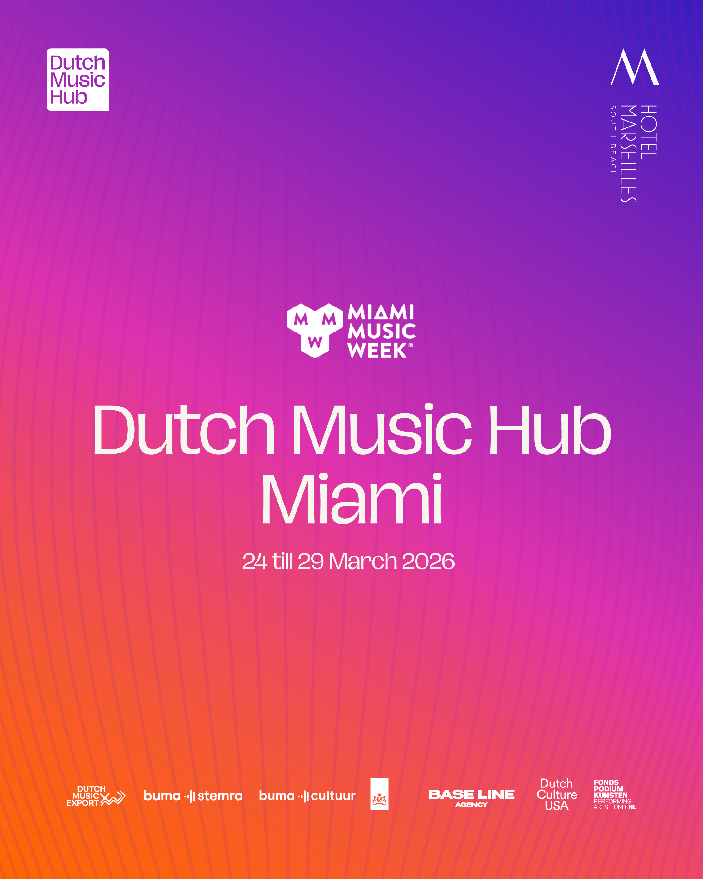 Dutch Music Hub Miami is the central meeting point for the Dutch electronic music industry during Miami Music Week. Hosted at Hotel Marseilles South Beach, the Hub serves as the official base for artists, industry professionals, partners and delegates throughout the week.